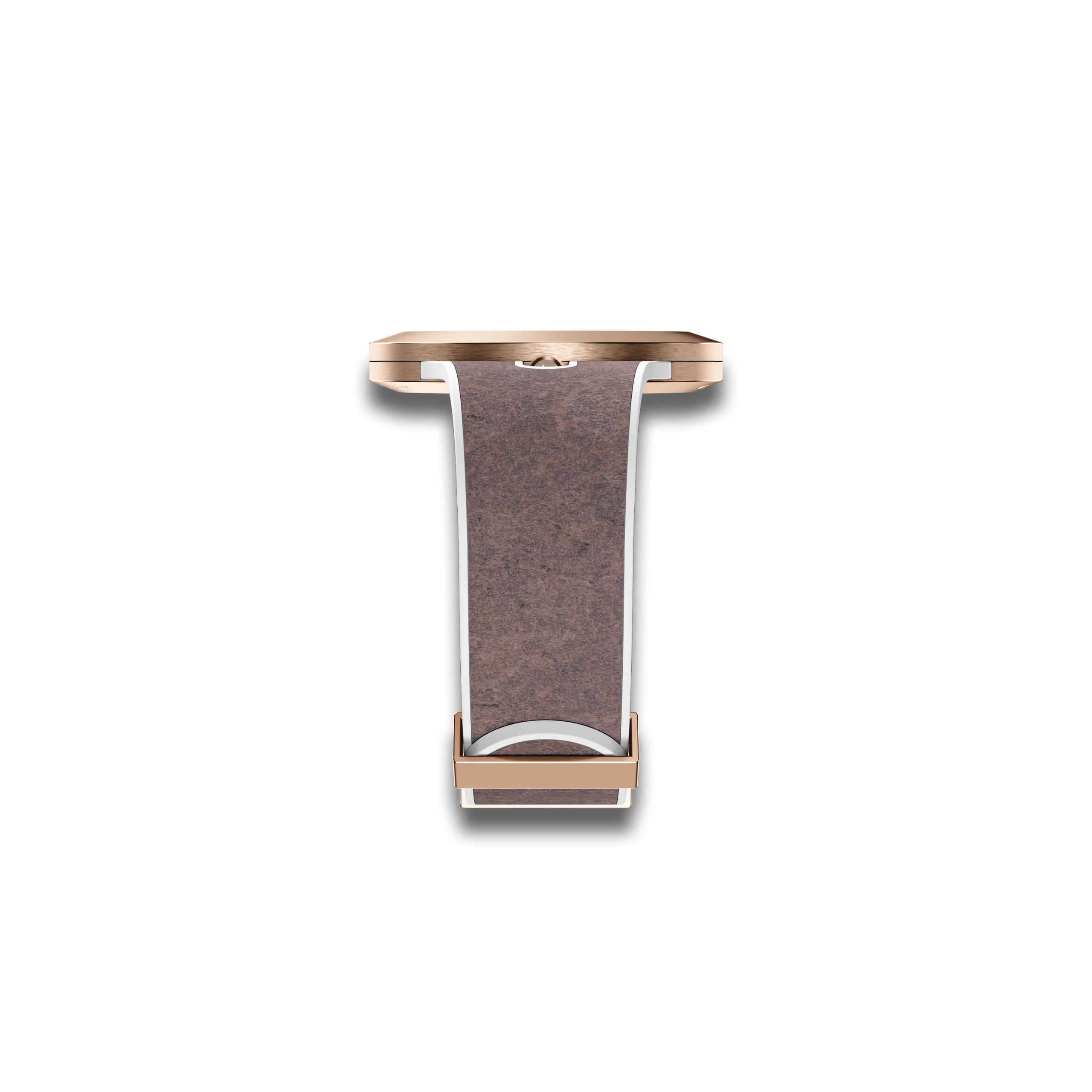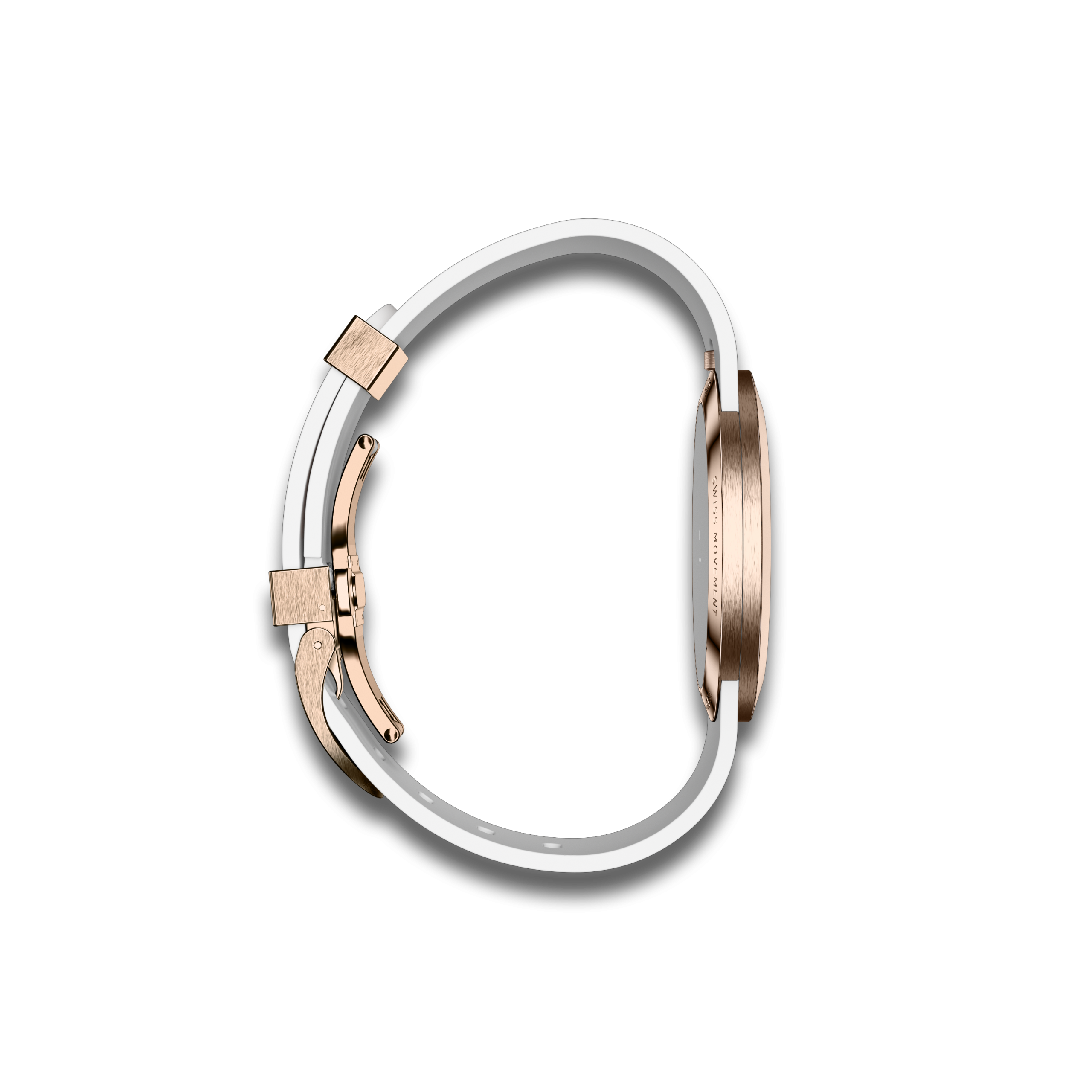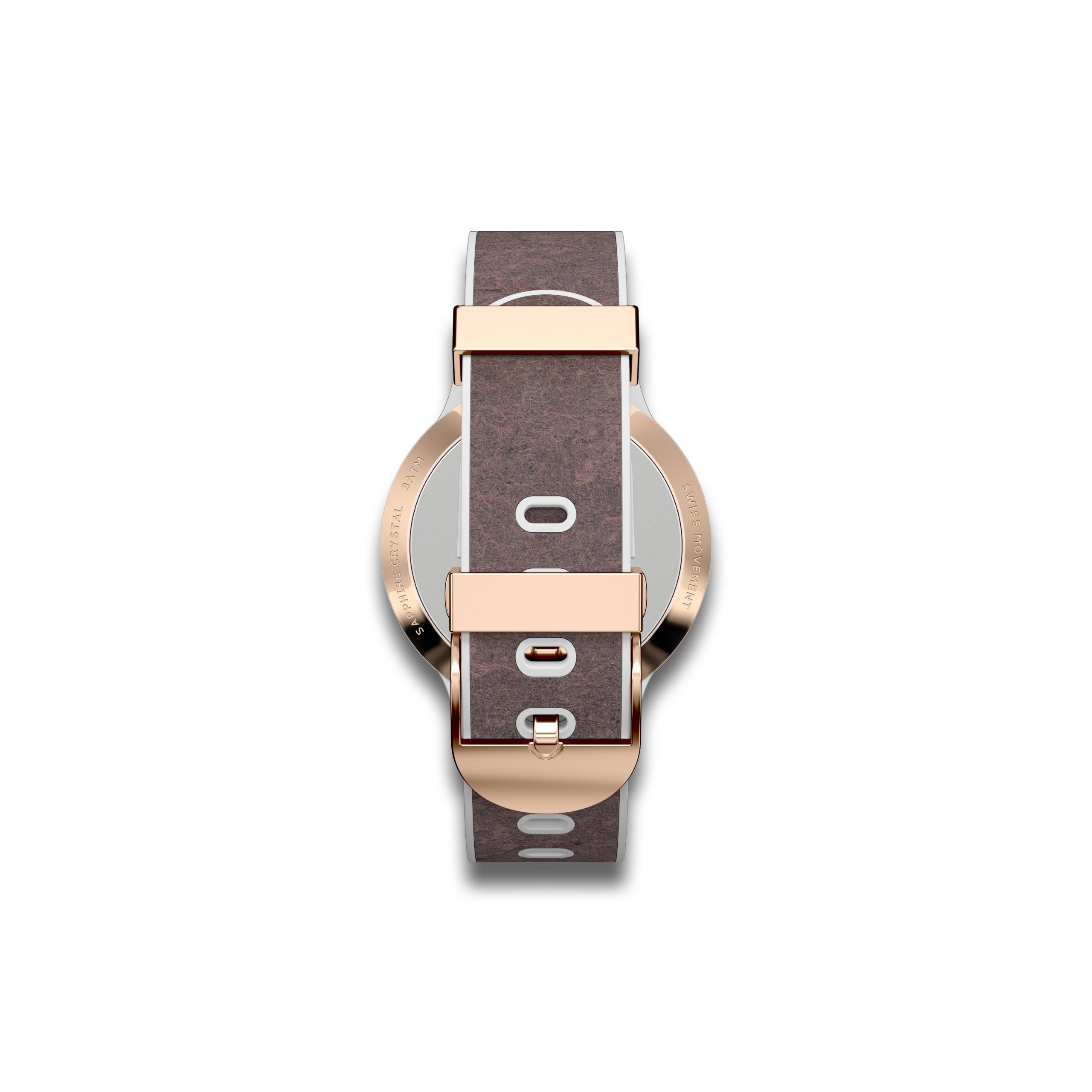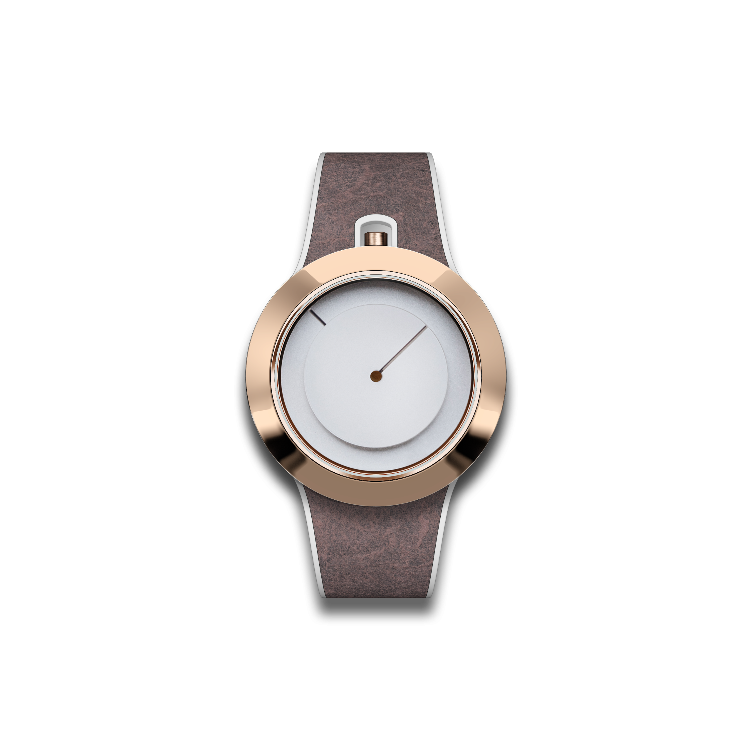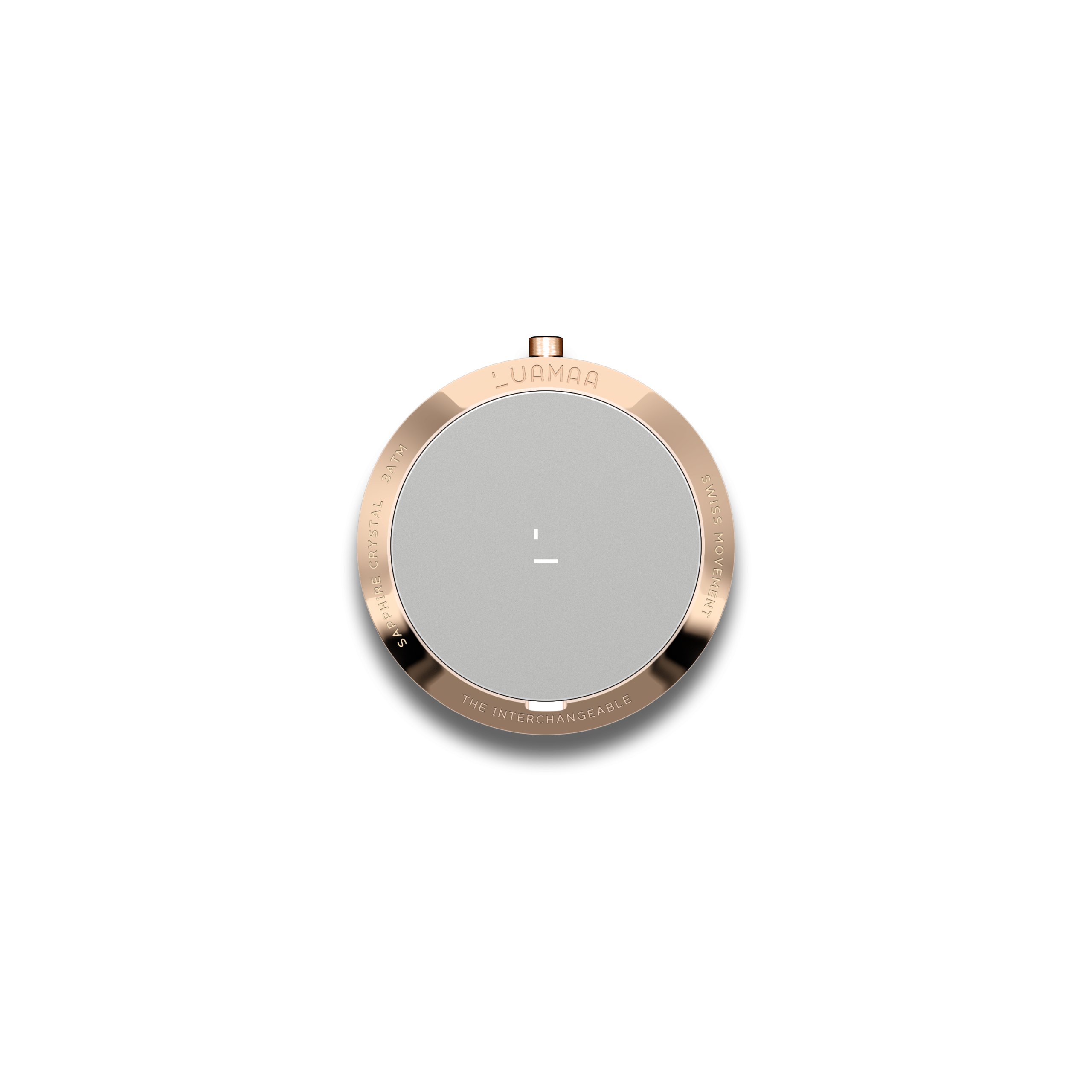 The Interchangeable is powered by Swiss movement, securely assembled in a stainless steel case. The surface of unconventional disc hands is a place for play of shadows and light reflection through the scratch resistant sapphire crystal. On the rubber is a natural, yet flexible sheet of slate stone, which combined make the watch strap. Along with a combination of milled stainless steel buckle and butterfly clasp, that enables you to take the watch off wrist with an ease. By enclosing the crown in the strap at 12 hours, minimized are the probable damaging causes to the watch movement. Threaded case and bezel solution makes changing the design of your watch a breeze.