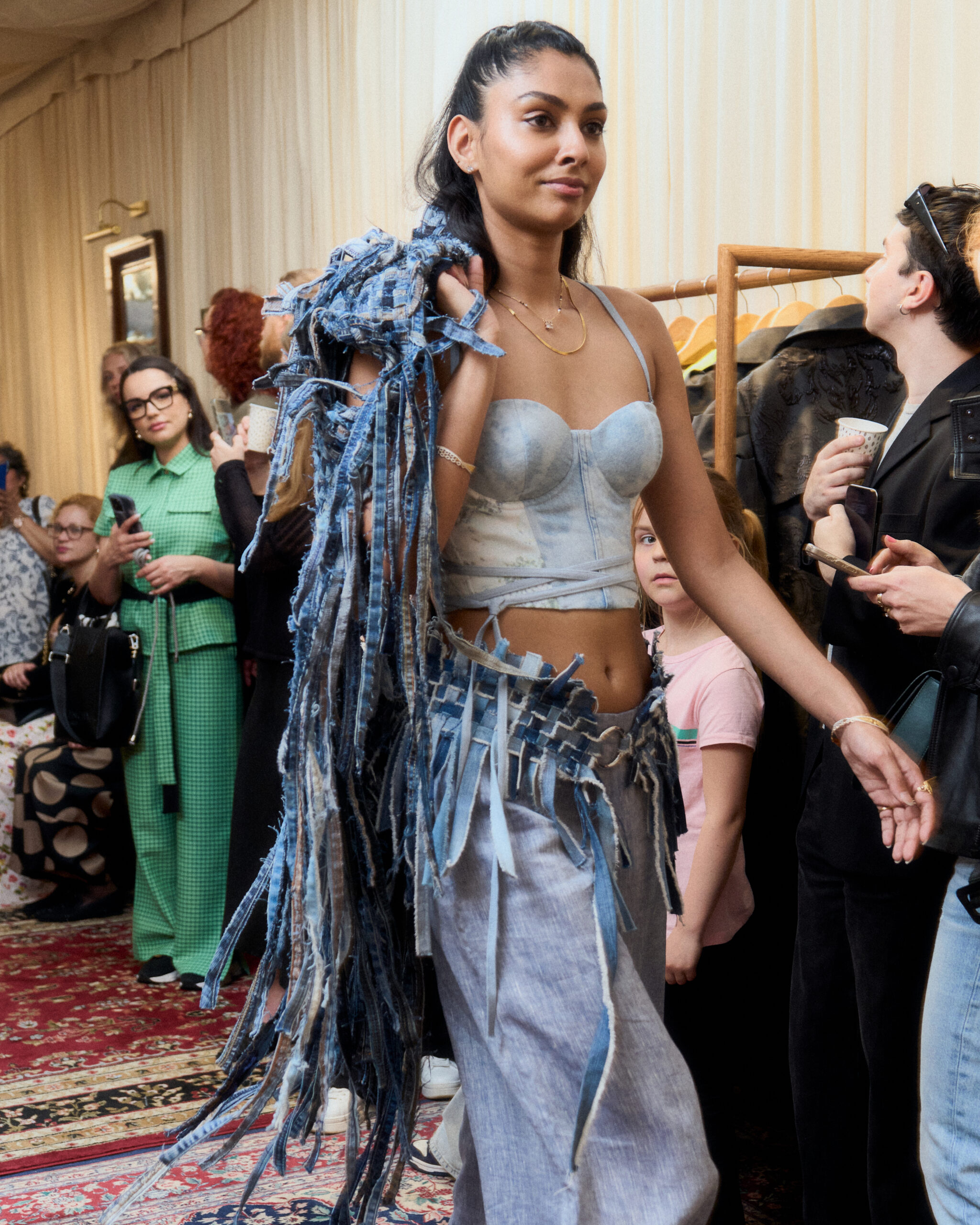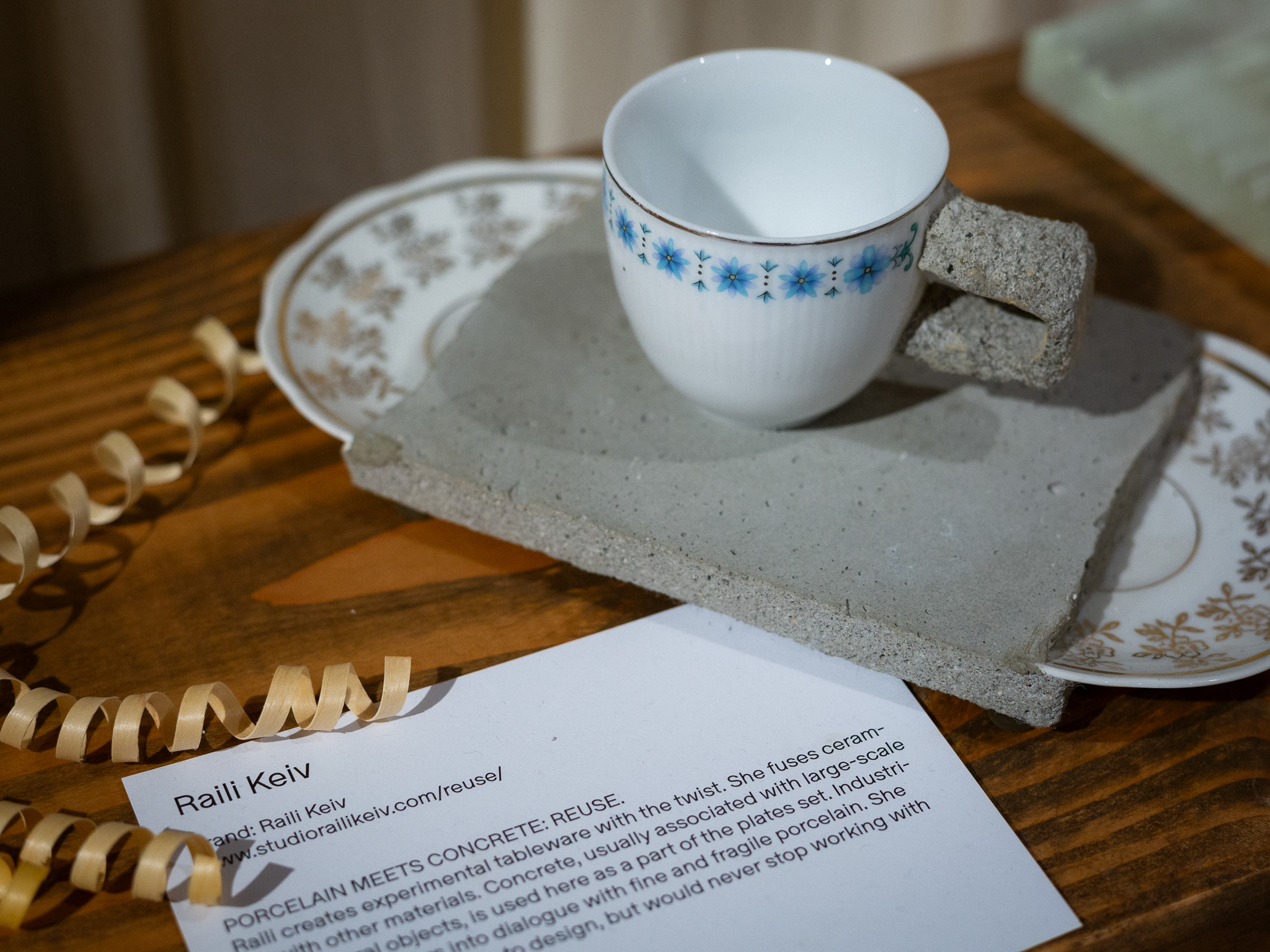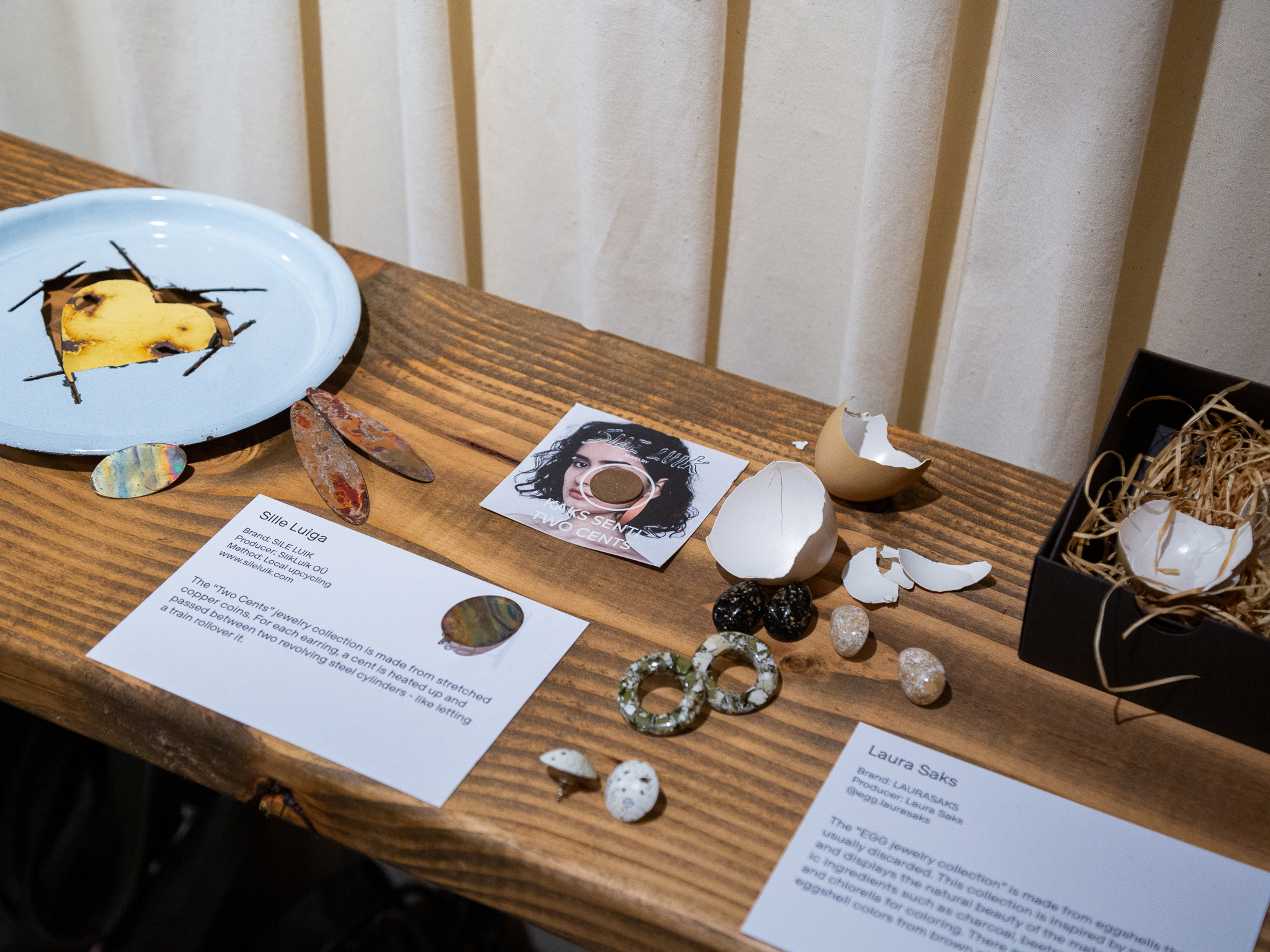 At the core of the exhibition is the international touring concept “UPMADE IN ESTONIA”, a collection that redefines discarded materials into bold new designs. Works on display include jewelry by Angela Orgusaare crafted from shattered auto glass, brooches by Urmas Lüüs made with Soviet enamel pots, Laura Saksi’s earrings from eggshells, denim lace clothing by Sandra Luks, WOH’s textile waste coat hangers, and Raili Keivi’s striking concrete and porcelain tableware. Each item tells a story of reinvention and ingenuity, rooted in Estonian values of sustainability.
